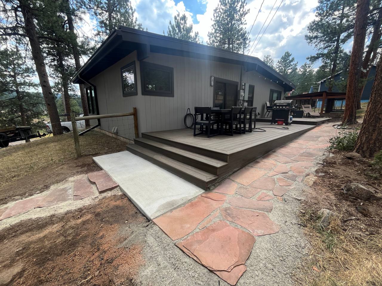 - PROJECT DESCRIPTION Ground level deck with custom hatch basement access doors and surrounding paving in Evergreen Colorado. Composite deck construction with paved walkways. Custom hatch doors construction and deck finish.